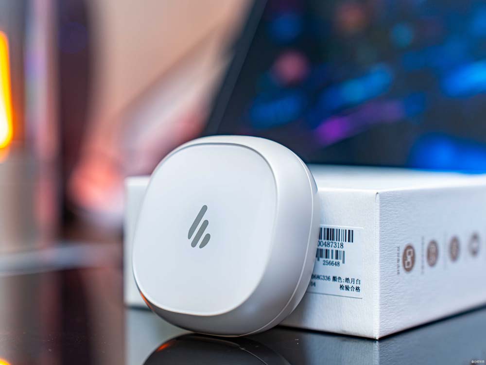 我这套是皓月白配色,其实更类似米白色。耳机仓走的整洁流畅的外观风格,圆润无边角设计让握持感相当舒适。耳机仓顶部印有漫步者的标志性 logo,采用了镜面处理工艺,质感也是尤为出色。