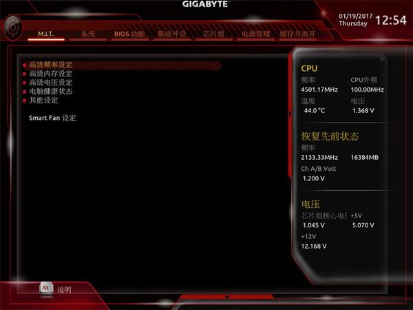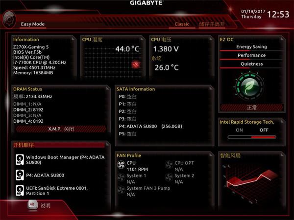 技嘉z270x gaming 5沿用了上一代x99 phoneix开始bios界面,界面是模块化的设计,所以在ez模式下你想看任何关于主板的参数都是一目了然,当然高级模式中的功能也是应有尽有,cpu和内存超频、bios升级、led灯光控制、监控、启动选项等等功能都是齐全的。