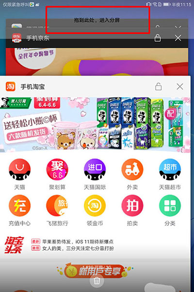 2、在出现所有后台运行程序的页面,长按你想要进行分屏的应用。将会出现“拖到此处,进入分屏”的字样,拖入位置即可。
