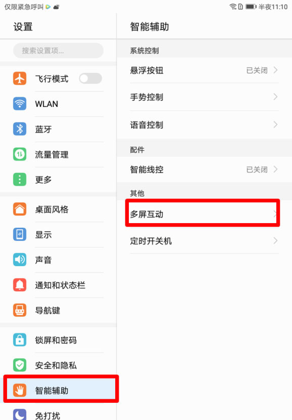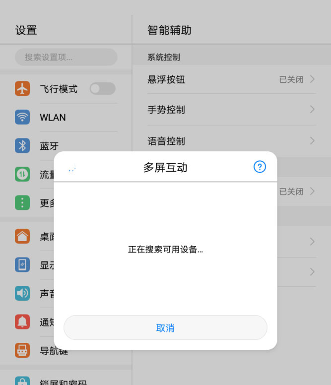 1、点击主界面中的【设置】——进入【智能辅助】——点击【多屏互动】