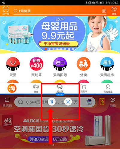 4、点击两个界面分界处的蓝色框按钮,可将上下两屏进行调换位置切换。