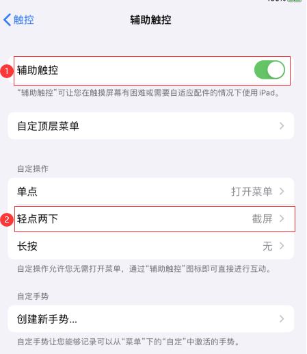 打开 ipad “设置”-“辅助功能”-“触控”,开启“辅助触控”,并在自定操作中进行设置,例如,您可以将“轻点两下”设置为“截屏”。