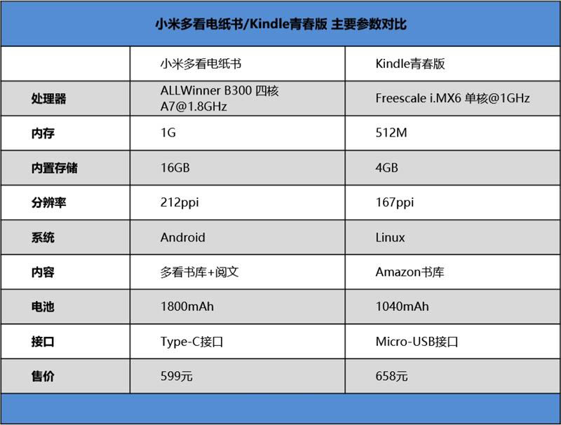 为了方便你更加直观的感受到小米多看电纸书相较于kindle青春版的性能差异,笔者特意做了一个表格,你可以看到全面碾压,并非笔者信口拈来,而是确实如此。