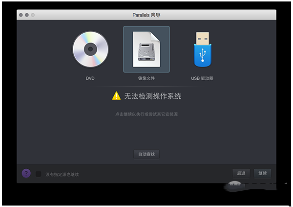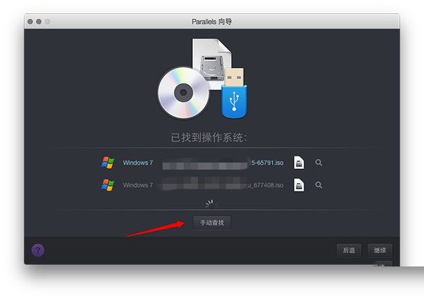 4、点击“手动查找”按钮,然后将win10的iso镜像文件拖动到parallels窗体中。它有可能无法识别win10,没关系,点击“继续”按钮。