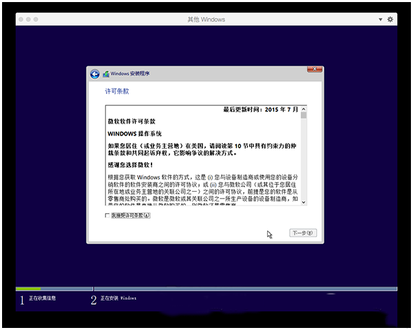 7、安装方法与实体机及其他虚拟机安装方式相同,基本上是下一步、下一步地点击。接受许可条款,然后点击“下一步”按钮,接下来按照提示安装即可。