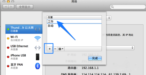 4、在弹出的位置编辑窗口中,点击右下方的“+”按钮,随后会新建一个位置的网络配置文件。我这里把它更改为“工作”,好了以后点击“完成”按钮,如图所示