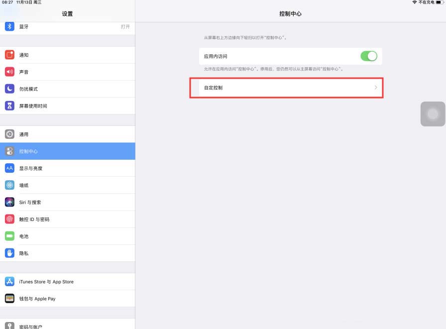 3、进入ipad控制中心设置页面,点击自定控制选项