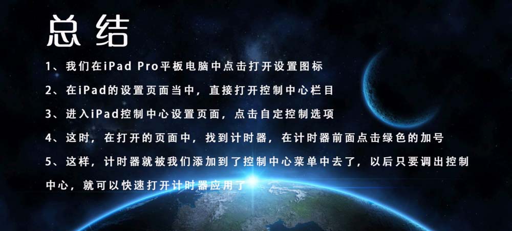 我们使用ipad平板电脑的时候,往往都会用到ios系统中的控制中心,只要手指从ipad屏幕底部往上滑动,就可以调出控制中心菜单页面。而且,控制中心菜单页面可以根据自己的需要来进行添加。那么,ipad pro苹果平板电脑控制中心怎样添加计时器?下面我们就来看看详细的教程。