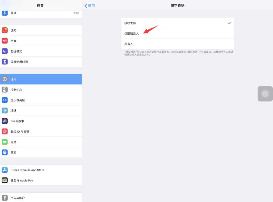 5、系统默认隔空投送处于关闭状态,根据自己的情况,可以选择仅联系人或者所有人
