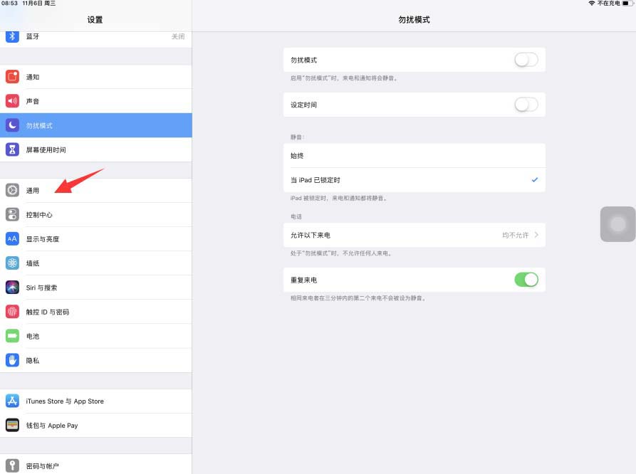 3、进入ipad pro的通用设置页面,点击打开多任务与程序坞