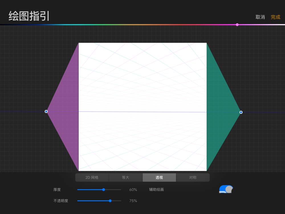 3.然后在画布两边分别设置两个消失点拉出参考线,再单击完成;
