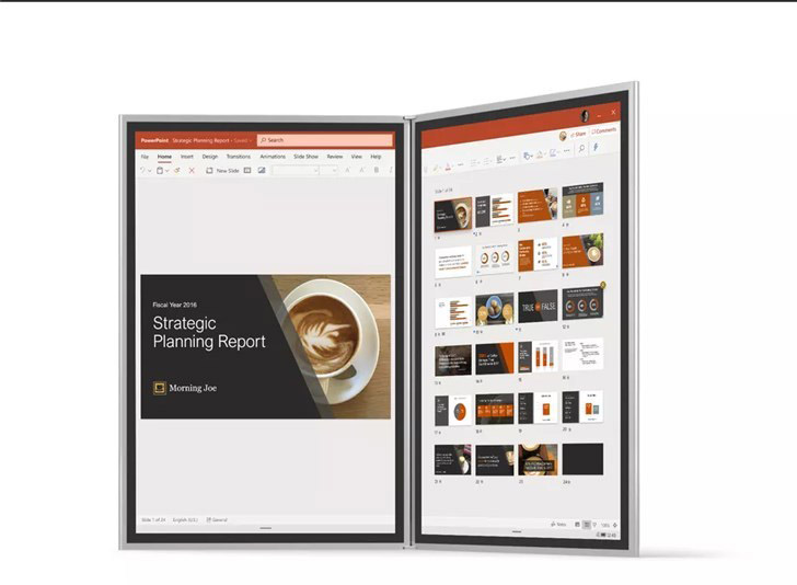 微软设想人们在各种情况下使用这些设备,其中某些情况甚至与人们当前使用笔记本电脑的方式相同。你可以旋转设备,应用程序和内容将智能地重排。微软的office应用程序甚至通过在powerpoint中添加幻灯片列表之类的东西来巧妙地利用第二显示屏。