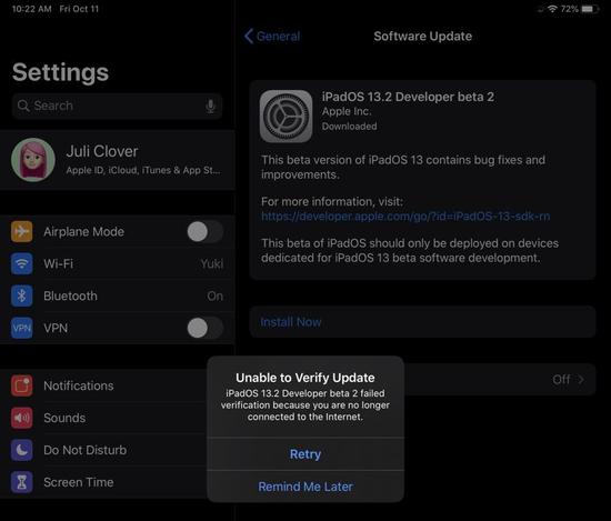 对于这个问题,苹果方面的反应也算是迅速,现在他们似乎已取消了“ipad pro”的ios 13.2 beta 2更新,现在测试用户尝试安装该软件时会收到一条错误消息,指出该更新由于缺少互联网连接而无法通过验证,尽管连接是正常的,该公司可能正在开发一个更安全的新版本。目前,建议“ ipad pro”所有者应尽量避免尝试安装ios 13.2。