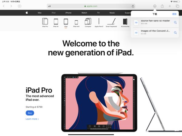 另外,全新的safari浏览器还支持“下载文件”,这也让ipad有了类似mac版safari浏览器的体验。在safari浏览器的右上角,我们可以看到一个“下载logo”,在这里即可查看所有此前下载好的文件。