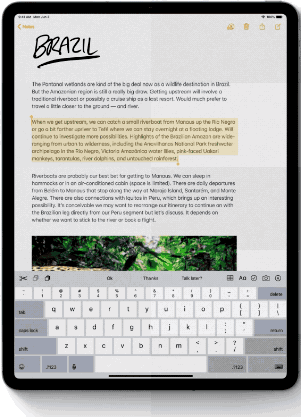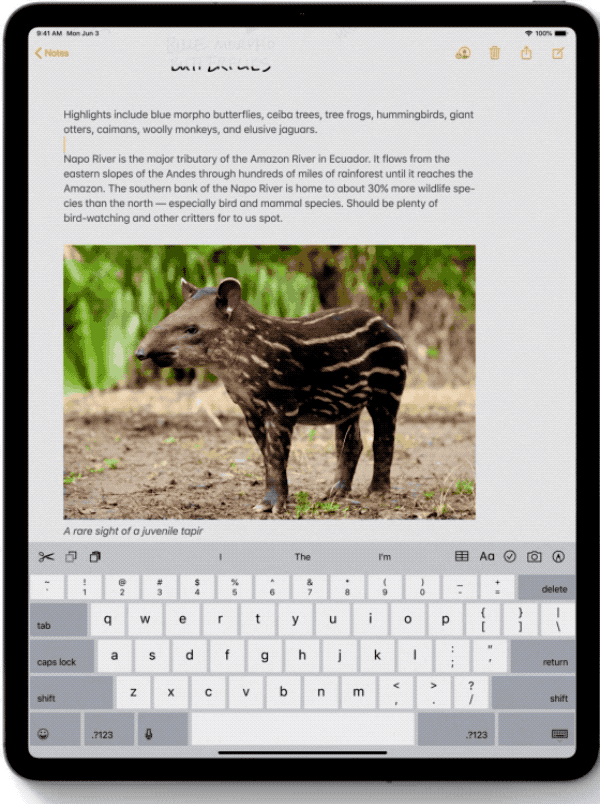 由于触屏的限制,手指在触摸屏幕操作光标时无法像鼠标指针一样精准,在移动光标或选择文本时并不顺手。为了改善文本编辑的体验,ipados加入了光标导航、文本选取、智能文本选择等手势,让手指操作的精度与鼠标无异。