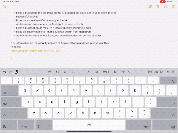 好在ipados的屏幕虚拟键盘经过重新设计。现在我们只需两指捏合键盘,即可将虚拟键盘缩小为手机一般大小,直接拖动底部时,还能将键盘拖动到任何想要的位置。同时颇受好评的滑动输入功能也来到了ipados上,这样既能扩大屏幕的有效显示面积,也不会降低文字的输入效率。
