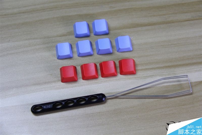 附带钢丝拔键器和十个替换键帽,包括四个红色、六个青色。