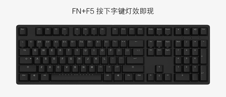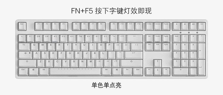 其二是按下fn+f5,全局不点亮模式,只有按下相应键位才会点亮,或者触发对应的灯光模式,包括单色单点亮、随机单点亮、单色涟漪、随机涟漪、单色激光、随机激光。
