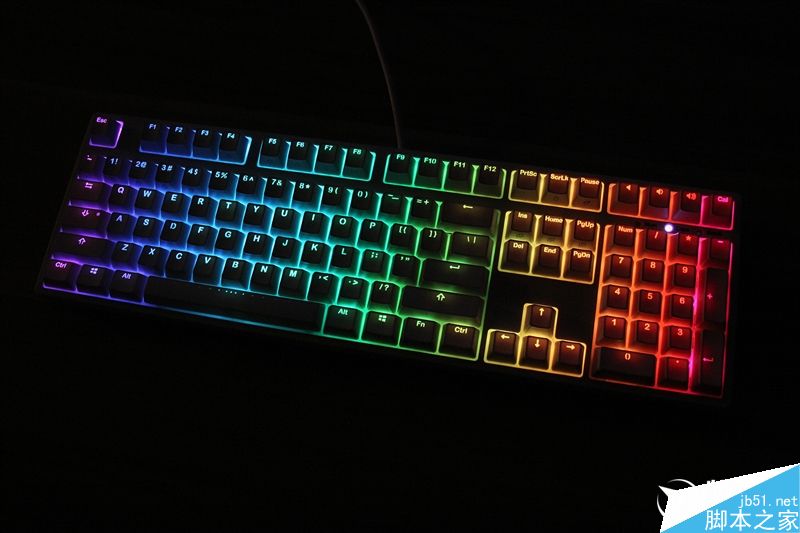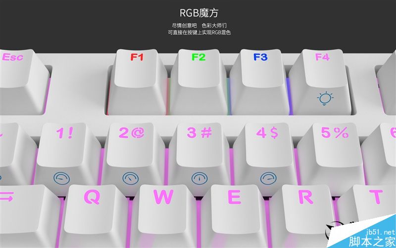 同样是这几种灯效下,还可以开启rgb调色模式,通过f1-f3分别调节灯值,单点亮模式下灯光效果在fn按键下实时显示,其中fn+f1为红色、fn+f2为绿色、fn+f3为蓝色。如果你对色彩调校混合有一套,就可以利用这种模式,直接在键盘上任意调色。