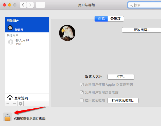 第二步、点击左下角锁型图标,解锁用户与群组,需要输入当前用户名密码,输入后点击“解锁”
