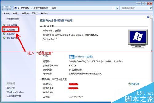 2、在左侧列表中单击“远程设置”进入远程设置。