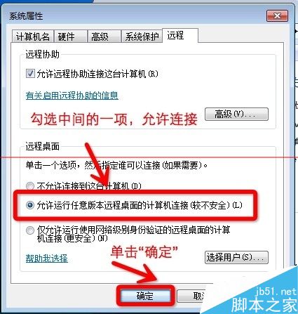 3、按照图片上得步奏,勾选“允许运行任意版本远程桌面的计算机连接(较不安全)”,选择后单击“确定”即可完成windows电脑端的所有设置了。下一步我们进入mac 运行“microsoft remote desktop”软件。