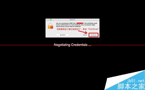 8、当您双击列表开始连接后,正常就会看到这个提示框了,单击“continue”继续就可以了。