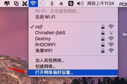 1、在屏幕右上角找到wifi图标,点击进入“打开网络偏好设置”。