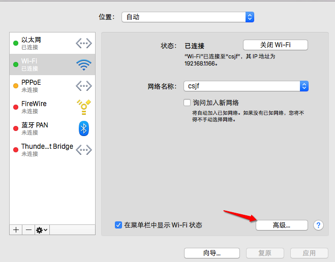 2、在网络设置窗口中,选中当前已经连接的网络,再点击底部的“高级”按钮,如图所示