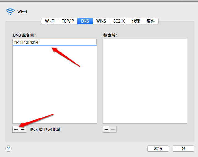 4、随后在 dns 设置窗口中点击左下方的 + 按钮,添加一个新的 dns 地址。