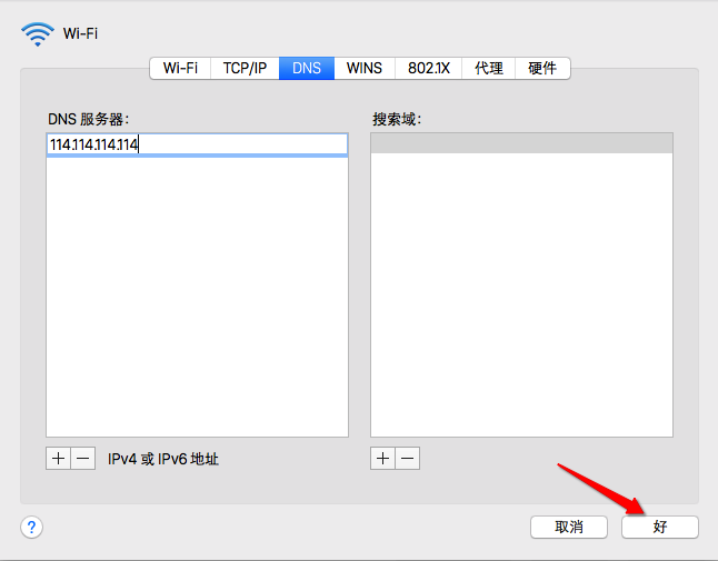 5、这里建议大家使用 114.114.114.114 或 8.8.8.8 这二个dns 地址,设置好以后点击“好”按钮。