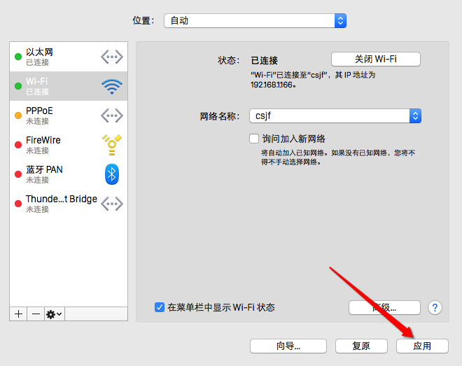6、最后返回网络设置窗口时,再点击“应用”按钮,对我们之前所更改的 dns 设置进行保存。