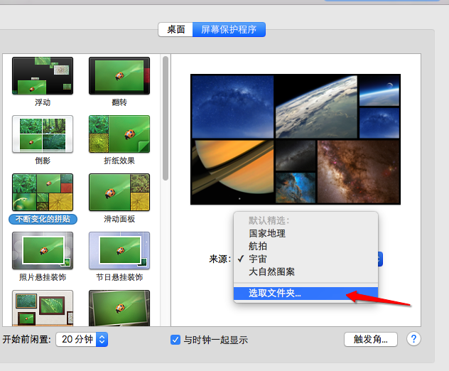 4、mac的屏幕保护程序同样是可以选择演示内容的来源的,在上图的“来源”中,我们可以挑选自己喜欢的图片来进行屏保演示。