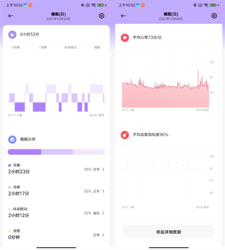 如果需要进一步了解详细信息,可在“小米穿戴”app中查看,将睡眠细分为深睡、浅眠、快速眼动、清醒这四类,还有睡眠时间段内的心率和血氧数据,都能够给出比较直观的评估,让用户大致了解自己的睡眠有什么需要改善的地方。