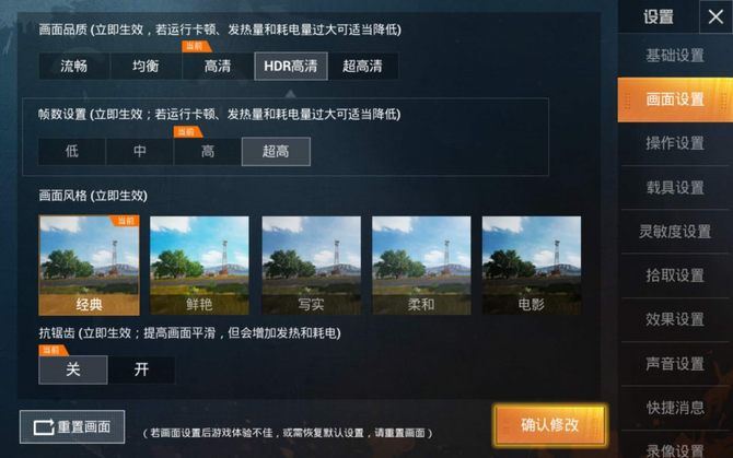 我们采用了目前非常火爆的《和平精英》进行测试,将画面设置为hdr高清,帧数设置为超高进行测试。