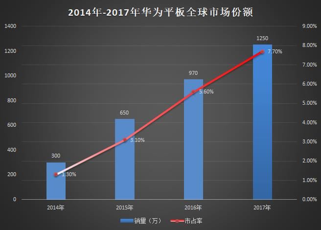 在平板市场大环境萎缩的情况下,华为在2014-2017年之间逆势高速增长,2017年销量相较于2014年增长416%。截止2018年第三季度,华为全球平板市场市占率已经高达8.9%,仅次于苹果、三星与亚马逊,成为中国第一。