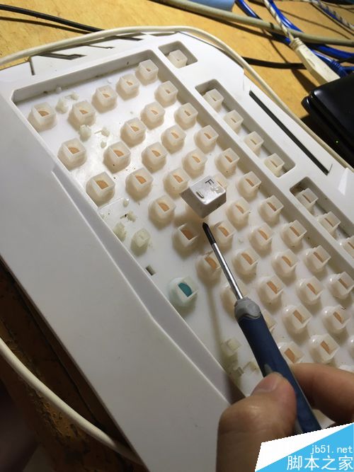 1、首先是把键盘帽拆下来,如图,用普通的小螺丝刀就可以了。这里大家不要害怕把键盘撬坏。因为键盘在设计时就已经考虑到了日后清洗。