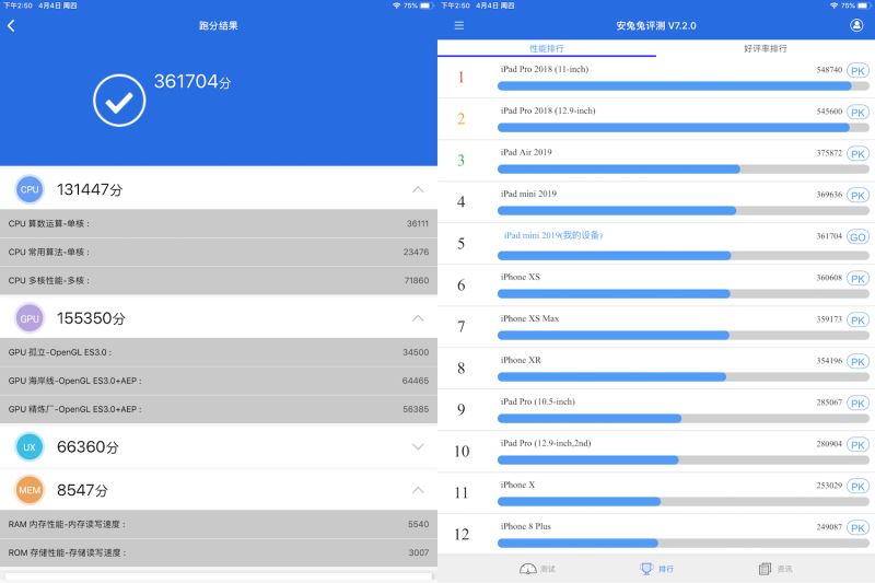 游戏方面的话,以a12的强劲性能来说,测试王者荣耀的意义不是很大,我们玩了下刺激战场,流畅度很高,开启极限帧率后也没有出现卡顿的情况。此外,和ipad air、ipad pro相比,新ipad mini的尺寸下操作起来更为趁手。
