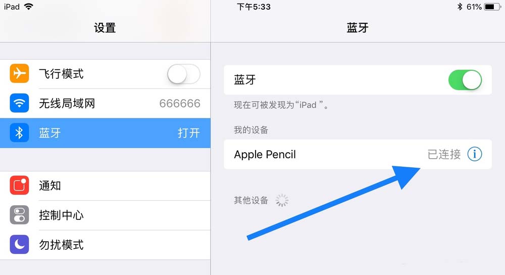 5、这样你的ipad与apple pencil就会自动连接了。可以在如下界面看到apple pencil已连接。如下图所示。