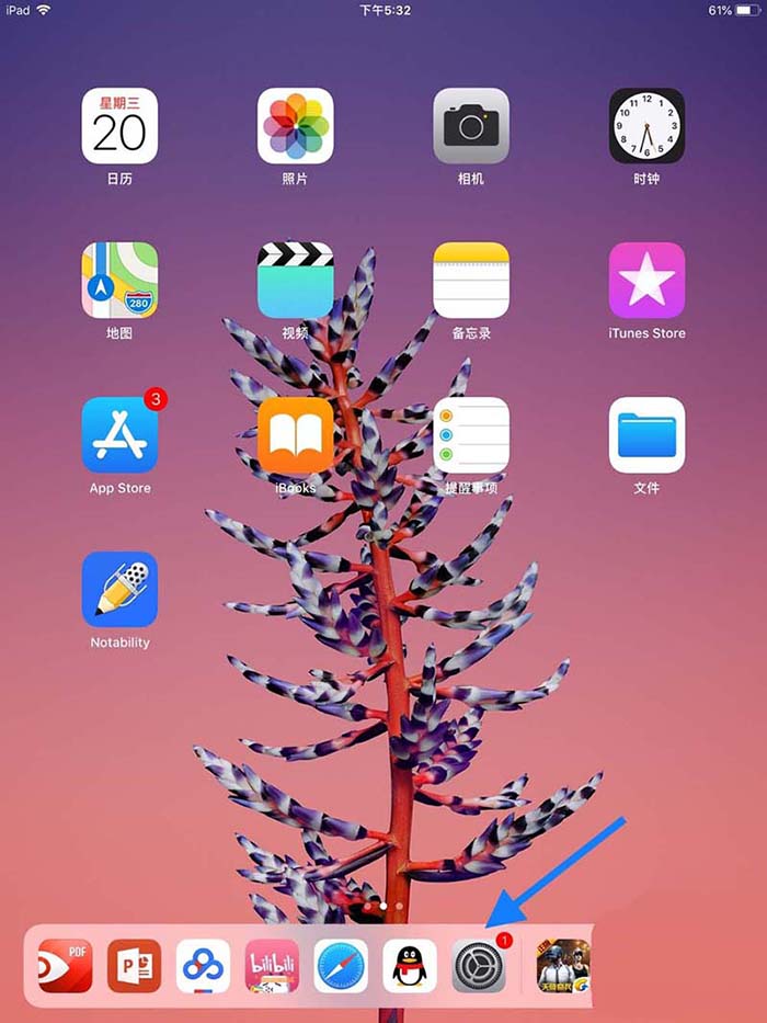 1、首先我们进入ipad的桌面。找到ipad设置,点击进入设置界面。如下图