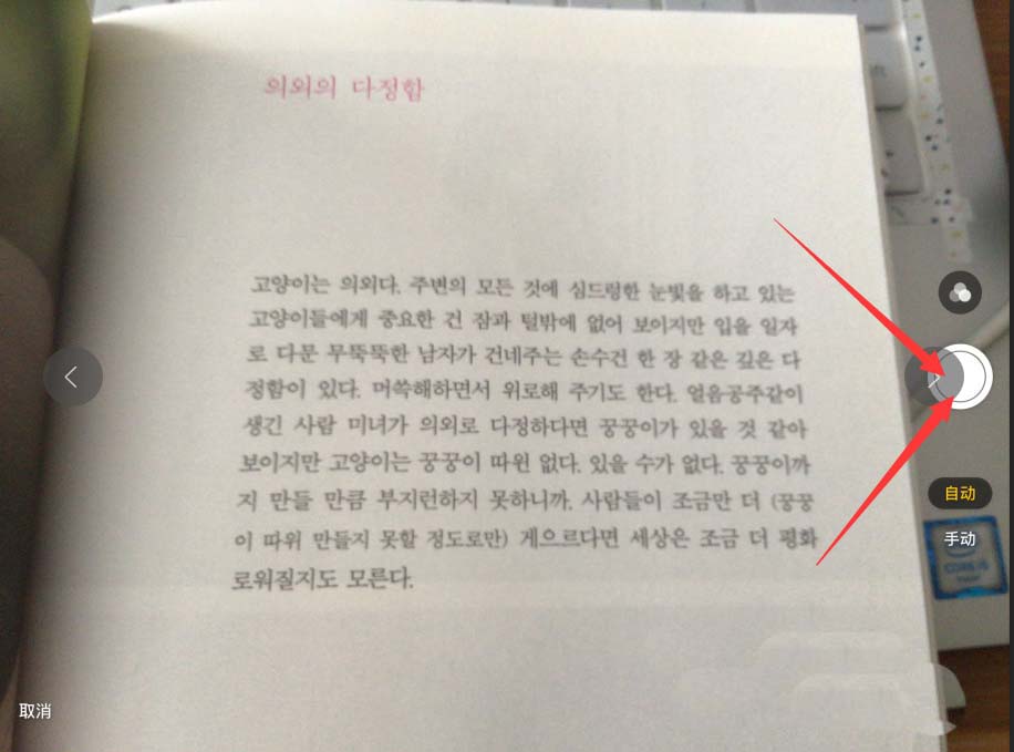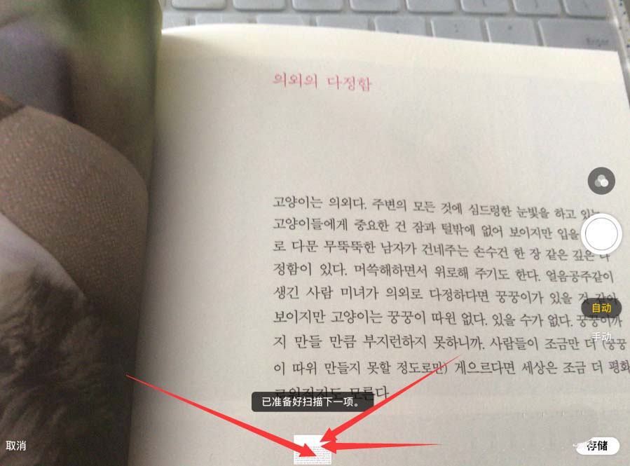 5、将ipad摄像头对准你要扫描的文稿。手指点击右侧的白色圆圈。
