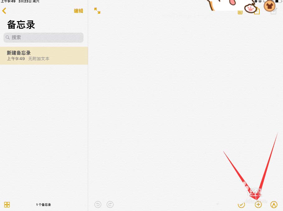 3、新建的备忘录就会在界面中跳出。我们仔细观察界面,找到最下面一排倒数第2个圆形的加号图标。手指点击它。