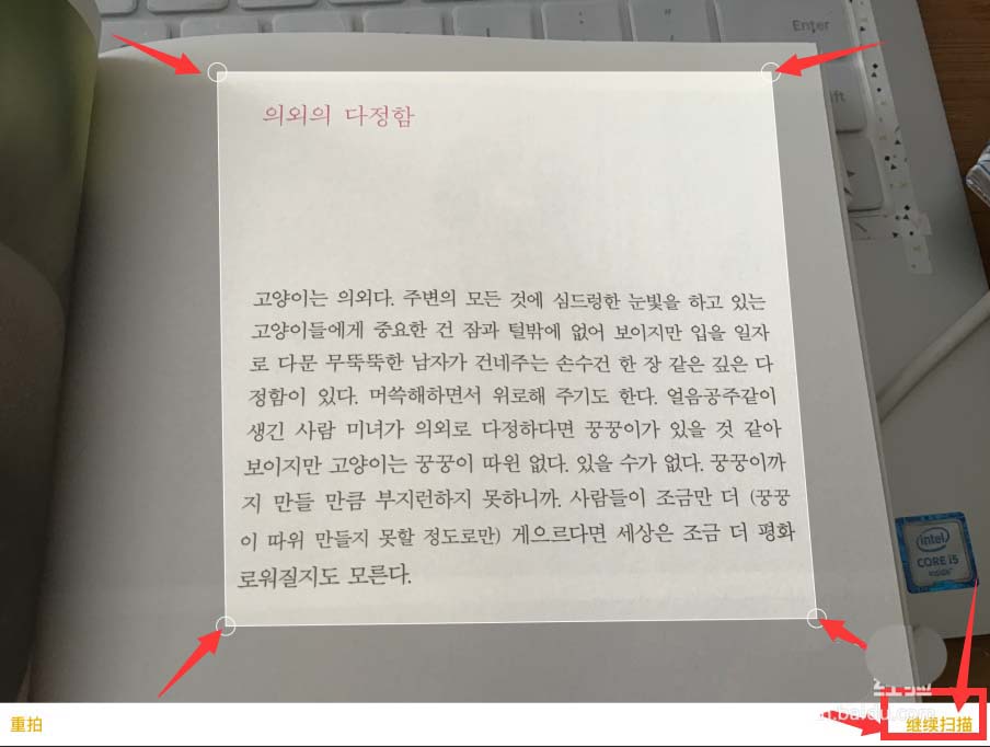 6、系统会自动辨识内容。我们可以手动拖动角上的圆圈来调整扫描的范围。调整完成以后,点击右下角的黄色图标继续扫描。