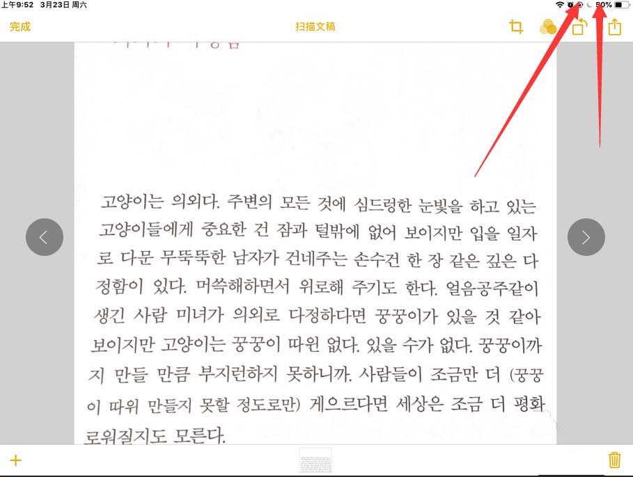 8、扫描文件被打开。我们手指放在ipad的右上角,向下拖动。