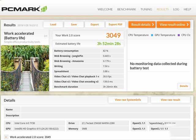 我们用pcmark8对续航进行了实测,在工作情景下,测试成绩为3小时52分。但考虑到pcmark续航测试对电池的压力是比较大的,正常使用时,续航时间还会多出不少。可以说,这个续航已经足够出差办公和娱乐使用了。