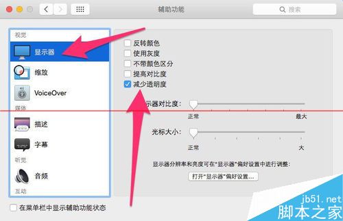 三:来到“辅助功能”里的显示器功能设置中,找到右边的“减少透明度”,勾选以后就不透明了,当你关闭透明度以后,很有可能就把你的mac减轻了一些工作量,让你的mac更加的轻松一些