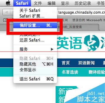 2、我们可以通过在safari中进行偏好设置来解决。首先在左上角safari的下拉选项中,点击“偏好设置”