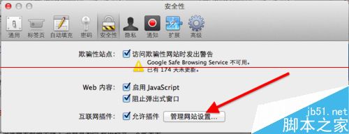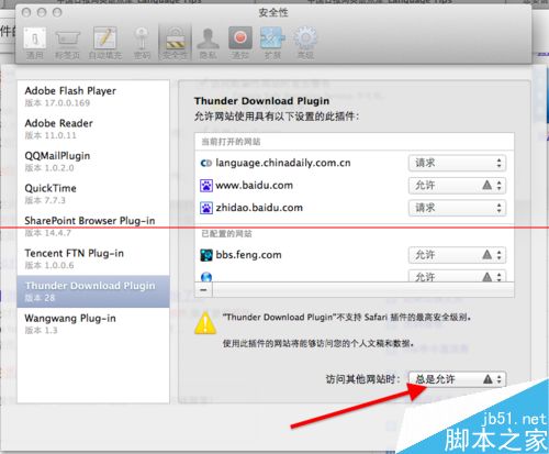 5、在安全管理设置中,对经常出现提示的插件(前提时你也觉得这个插件是基本安全的,因为苹果虽然提示很烦,但是也是出于安全性),在右下角选择“总是允许“。
