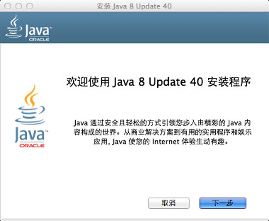 安装向导将显示 "welcome to java"(欢迎使用 java)安装屏幕。单击 下一步: