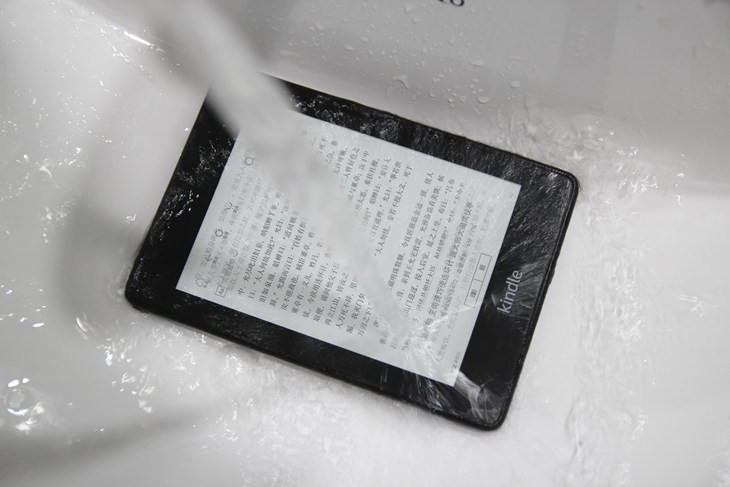 讲真在测试之前还是有些后怕的,不过kindle品质保证还是让我下定决心将测试进行下去,最终结果也是出人意料的好,在水里并未有太大的影响,页面正常显示内容,支持阅读(不过官方不建议在水下使用)。拿出后非常容易即可将表面水渍清洁干净。可以预见,在日常实际使用过程中,不管是吃饭途中的意外汤汁滴溅还是更多与水有关的环境都不会成为阻碍kindle paperwhite正常阅读的使命。